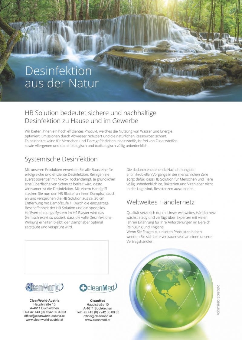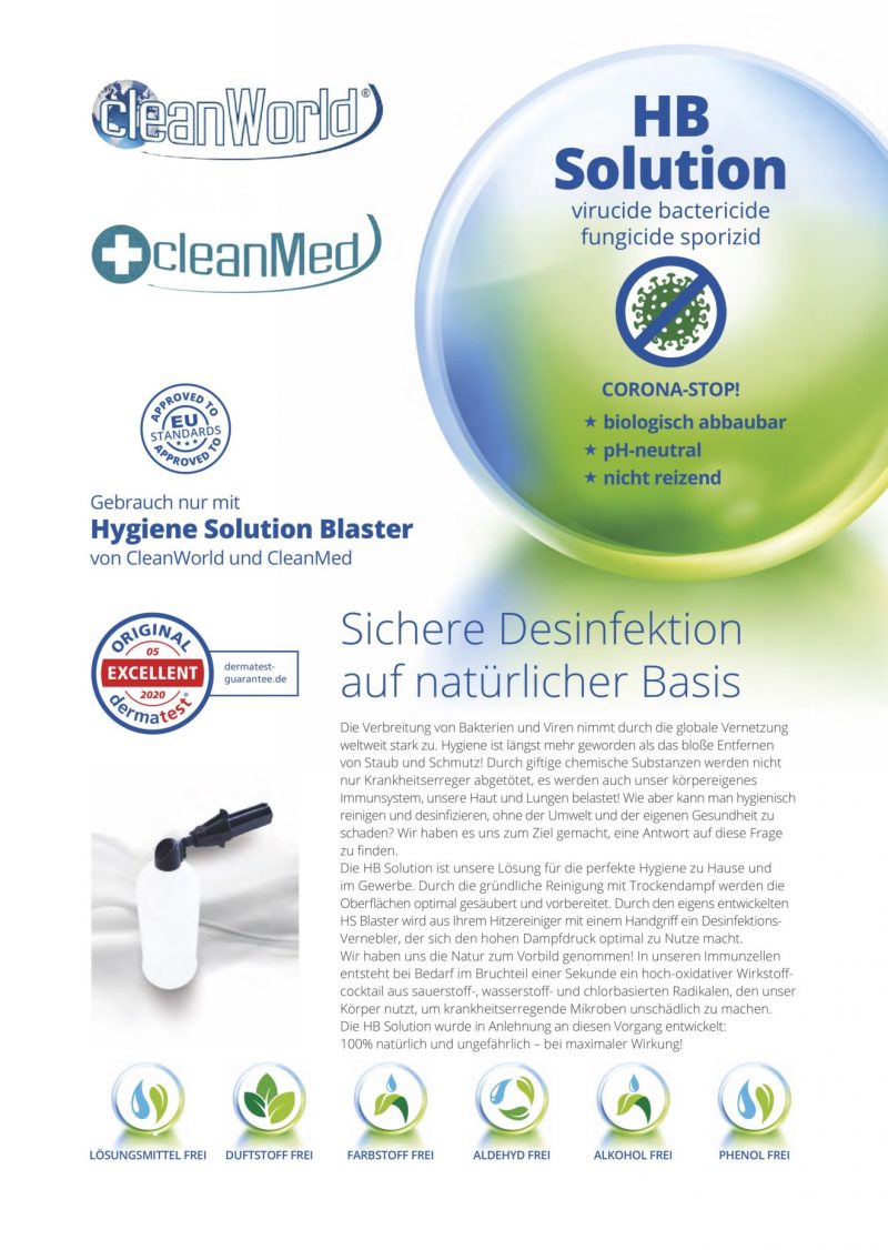 Die HS-Solution ist als gebrauchsfertige Lösung zur Verwendung mit dem Cleanworld Reinigungssystemen geeignet.Sie entfernt 99,9% der Bakterien Viren Pilzen und Sporen.